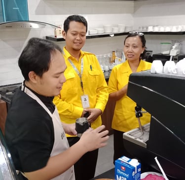 Sesi berikutnya pindah ke Le Cafe, tempat yang cozy buat belajar bikin kopi. Di sini ada Kak Valdo dan staf Le Cafe yang ngasih penjelasan soal dasar - dasar latte art mulai dari teknik frothing susu, dan lain sebagainya.