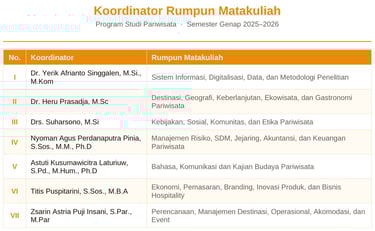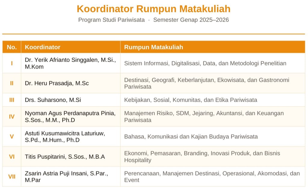 Koordinator Rumpun Mata Kuliah Program Studi Pariwisata Semester Genap 2025/2026