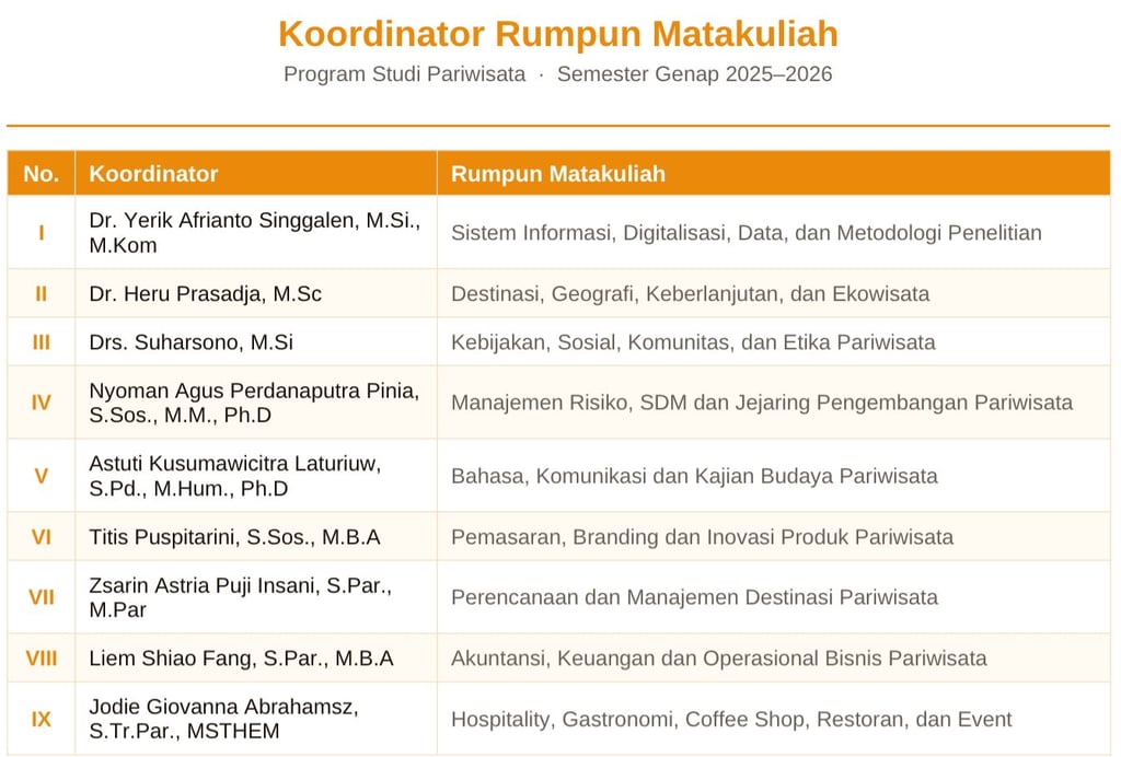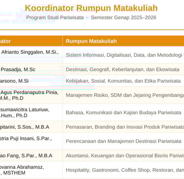 Sembilan rumpun matakuliah Program Studi Pariwisata Unika Atma Jaya untuk Semester Genap 2025–2026 telah ditetapkan koordinatornya, mencakup bidang sistem informasi, destinasi, kebijakan, manajemen risiko, bahasa, pemasaran, perencanaan destinasi, keuangan, hingga hospitality dan gastronomi.