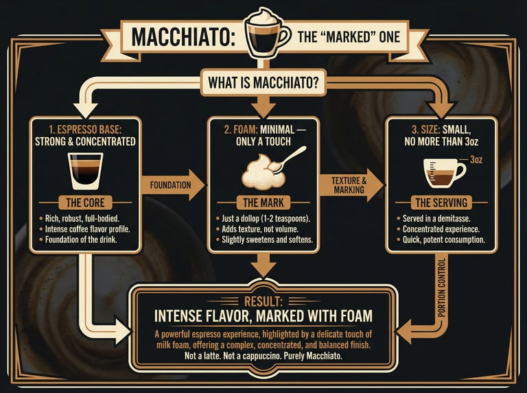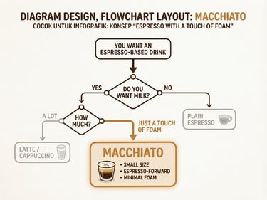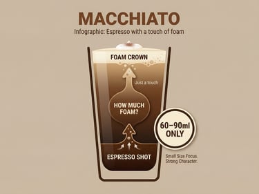 Panduan macchiato ini menonjolkan konsep “espresso with a touch of foam” melalui ukuran sajian yang kecil, foam yang sangat sedikit, dan karakter rasa kopi yang kuat serta dominan.