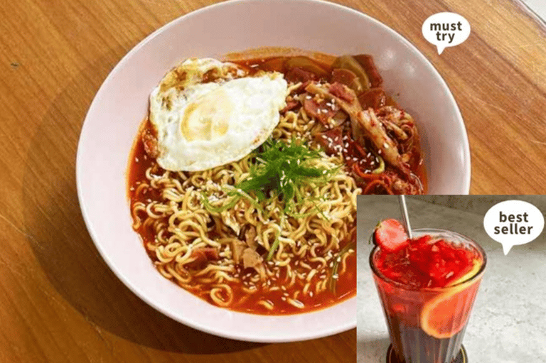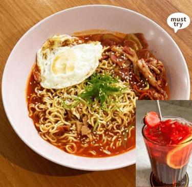 Kebetulan terakhir kali aku berkunjung bersama seorang teman, kami mencoba beberapa item dari menu. Kami memesan Calicoffice Korean Noodle yang merupakan korean ramyun dengan kuah kimchi pedas yang dilengkapi dengan sosis, smoked beef, dan kimchi lagi. Aku juga memesan bestseller drink di kafenya, Berry Jasmine yang merupakan perpaduan jasmine tea dengan sirup stroberi dan dilengkapi dengan potongan buah stroberi dan jeruk yang segar. Makanan pedas
