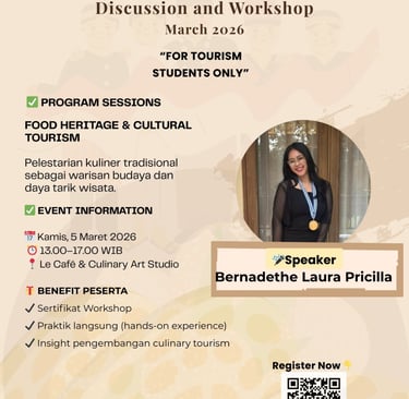 Mari bergabung dan jadilah bagian dari generasi pariwisata yang mampu melihat kuliner sebagai kekuatan budaya, identitas destinasi, dan peluang pengembangan wisata yang berkelanjutan.