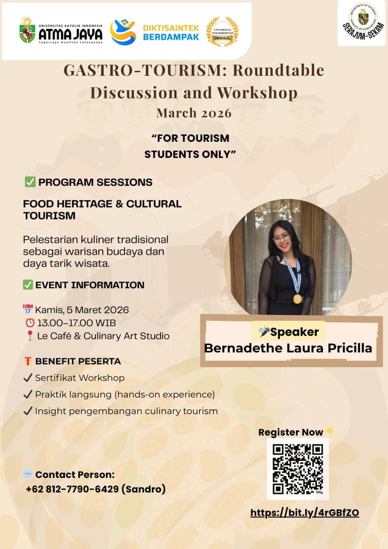 Jangan lewatkan kesempatan untuk memperkaya wawasan dan pengalaman melalui kegiatan Gastro-Tourism: Roundtable Discussion and Workshop yang dirancang khusus untuk mahasiswa pariwisata. Kegiatan ini mengangkat tema “Food Heritage & Cultural Tourism”, dengan fokus pada pentingnya pelestarian kuliner tradisional sebagai bagian dari warisan budaya sekaligus daya tarik wisata yang bernilai.
