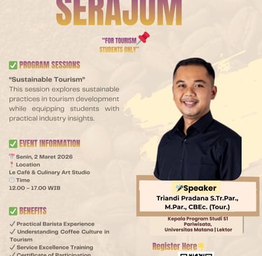 Kegiatan ini akan menghadirkan Triandi Pradana S.Tr.Par., M.Par., CBEC. (Tour.), Kepala Program Studi S1 Pariwisata Universitas Matan, yang akan membagikan pengetahuan, pengalaman, dan perspektif praktis seputar pengembangan pariwisata berkelanjutan. Tidak hanya menambah pemahaman akademik, peserta juga berkesempatan memperoleh practical barista experience, memahami coffee culture dalam pariwisata, meningkatkan wawasan tentang service excellence, serta mendapatkan certificate of participation.